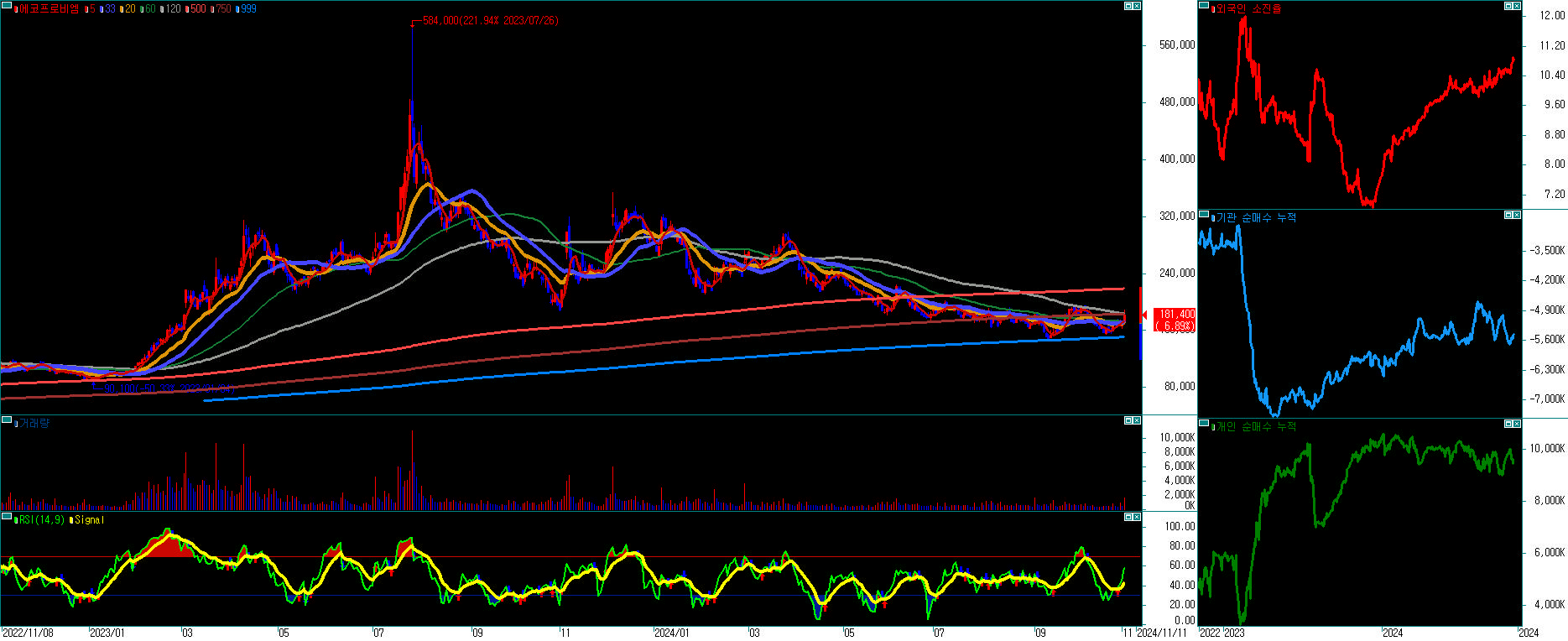 - 지지선 및 저항선 분석 : 에코프로비엠의 주가는 일정한 패턴을 보일 가능성이 높으므로, 지지선과 저항선을 활용해 매수 및 매도 타이밍을 잡는 것이 유효합니다.