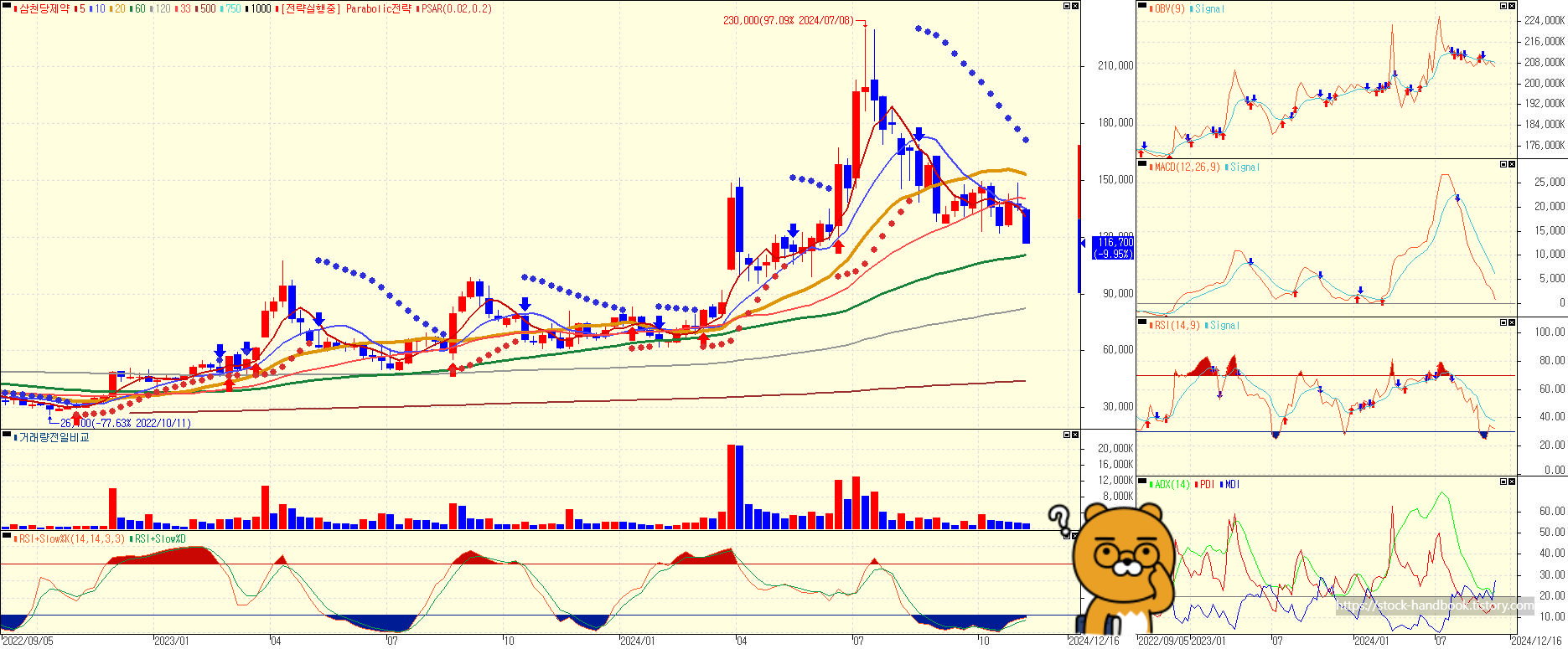 - 월봉 차트에서는 Parabolic SAR이 여전히 주가 아래에 위치해 있어 상승 추세가 유지되고 있지만, 최근의 하락세로 인해 추세가 약해질 가능성이 보입니다.