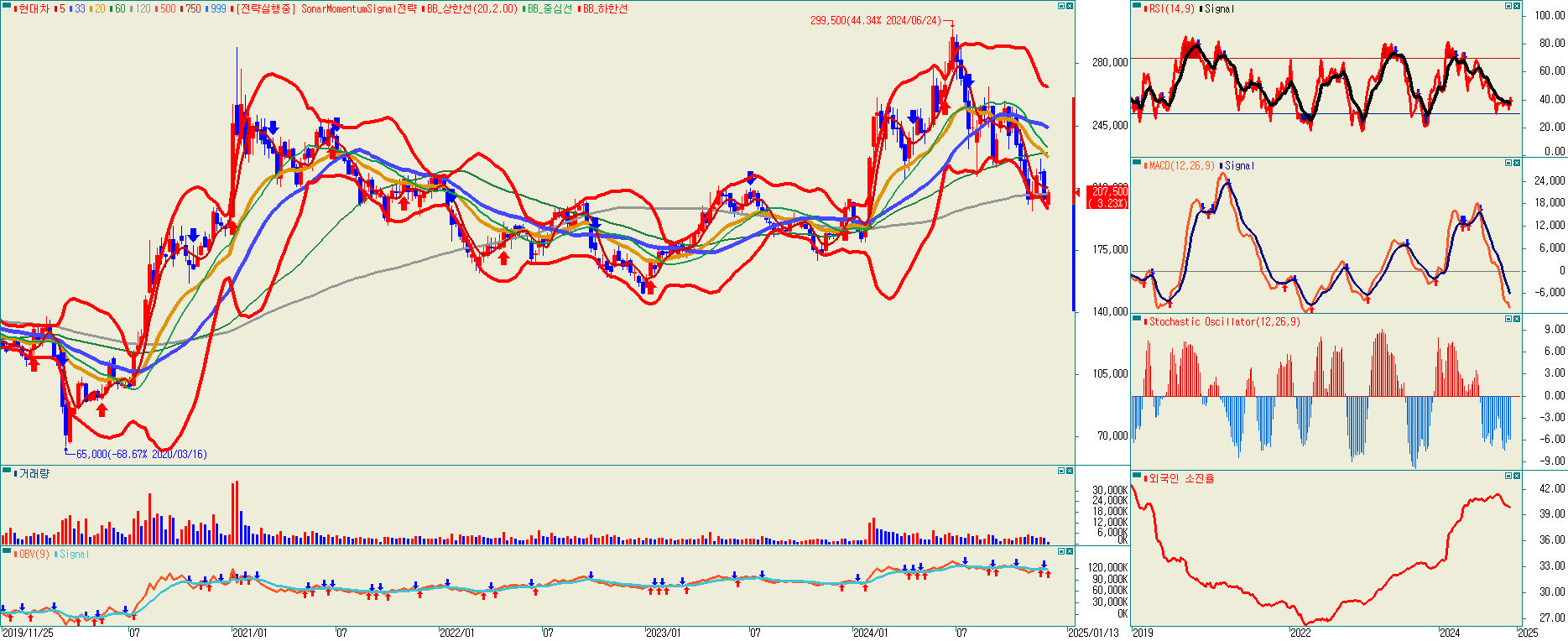 장기적 관점에서 현대차는 여전히 상승 추세가 유효하며, 현재의 조정 국면은 중장기 매수 기회로 활용할 수 있을 것으로 판단됩니다