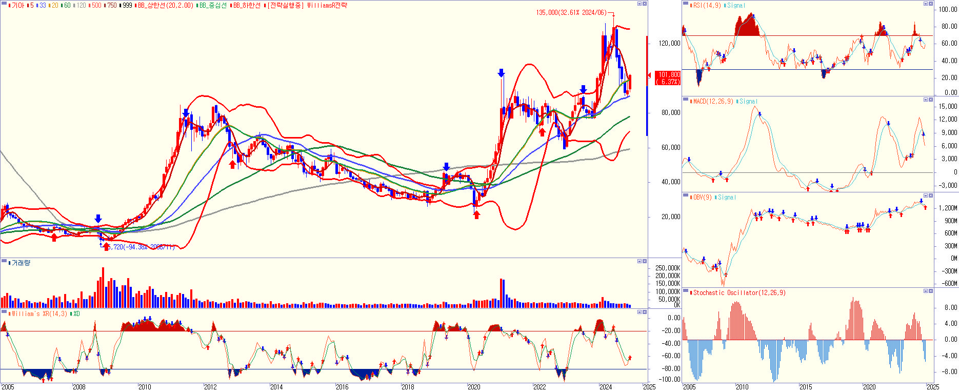 - 현재 101,800원 선에서 거래되고 있으며, 최근 하락 추세에서 반등을 시도하는 모습