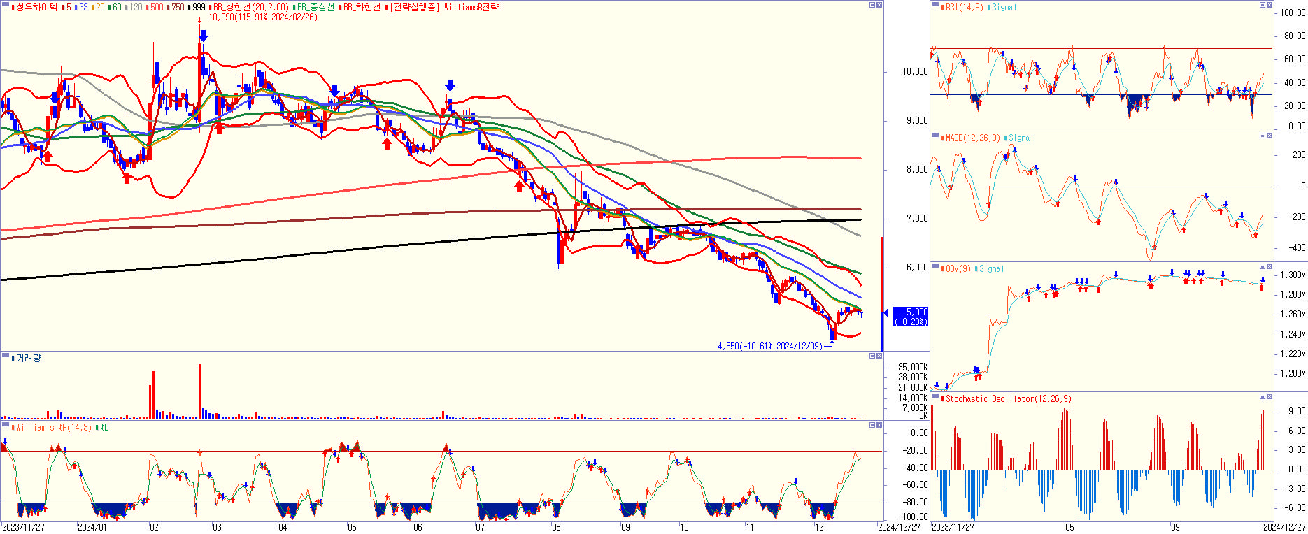 현재 성우하이텍은 모든 시간대에서 하락 추세가 뚜렷하며, 기술적 반등 신호가 미약한 상황입니다