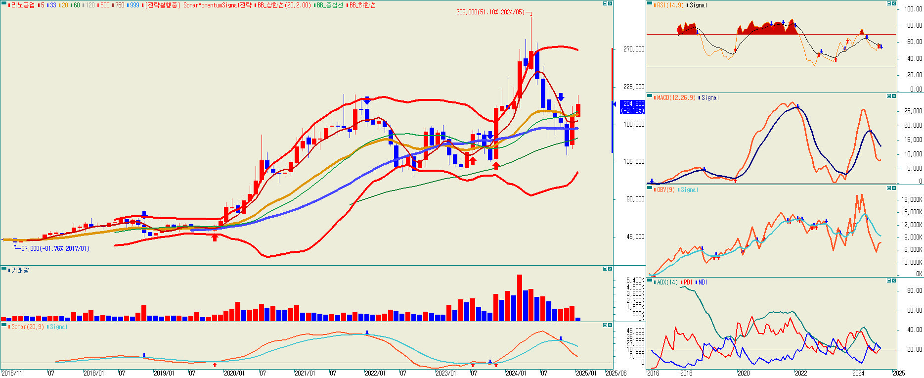 리노공업 주식매수 시점 분석 (SonarMomentumSignal 전략 활용)
