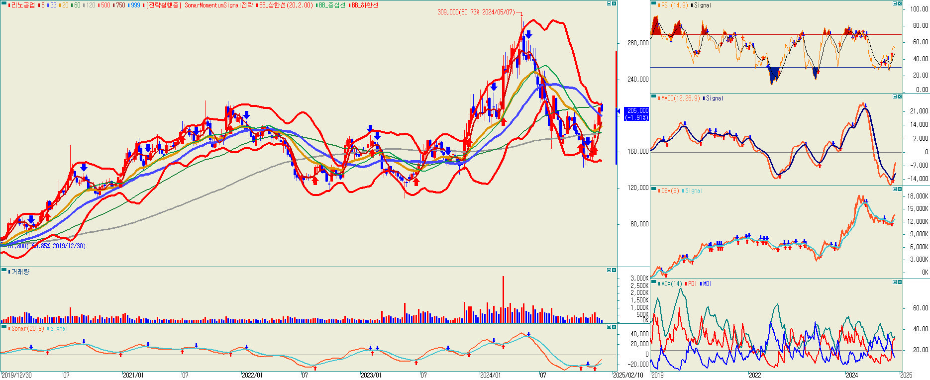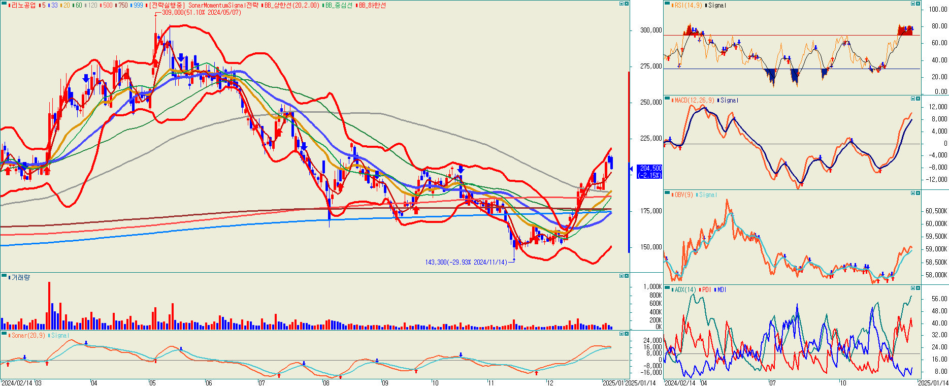 현재 리노공업은 단기 조정 국면에 진입했으나, 중장기 상승추세는 여전히 유효한 상태입니다. 단기적으로는 변동성이 확대될 수 있으나, 주요 지지선에서 반등할 경우 상승추세 재개 가능성이 높아 보입니다