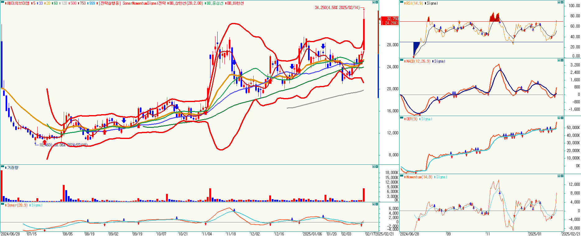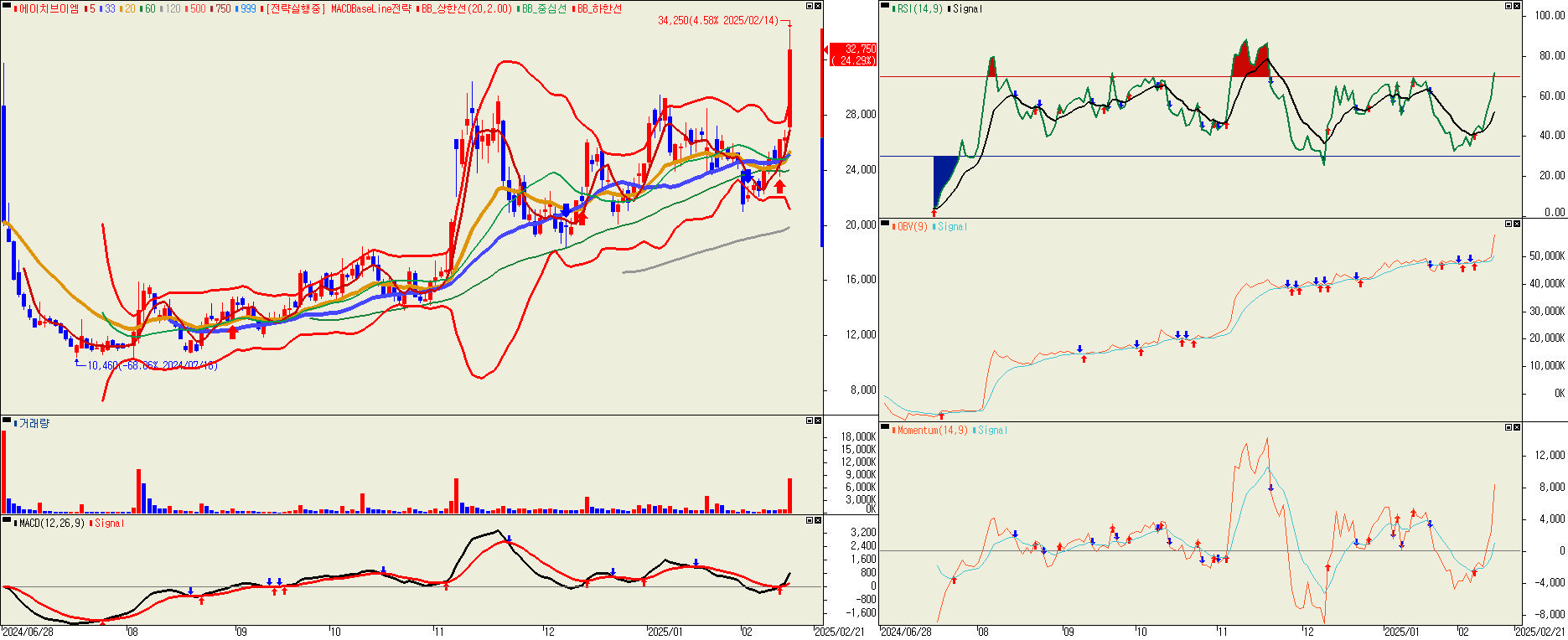 에이치브이엠 주식은 현재 강한 상승 추세에 있으나 과열 신호(RSI 과매수, 볼린저밴드 상단 돌파)가 나타나고 있어 단기적인 조정 가능성을 염두에 둬야 합니다