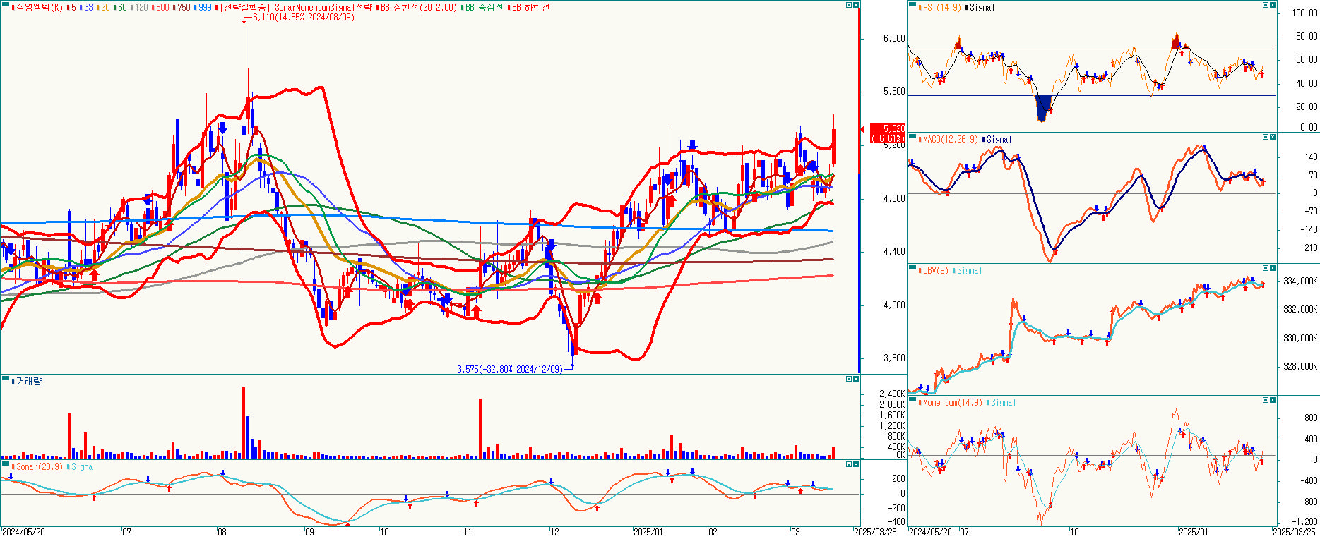 - 추세: 삼영엠텍은 오랜 횡보를 끝내고 상승 추세로 전환되었습니다. 주요 이동평균선이 상승세로 정렬되며 장기적인 강세장이 형성되고 있습니다.