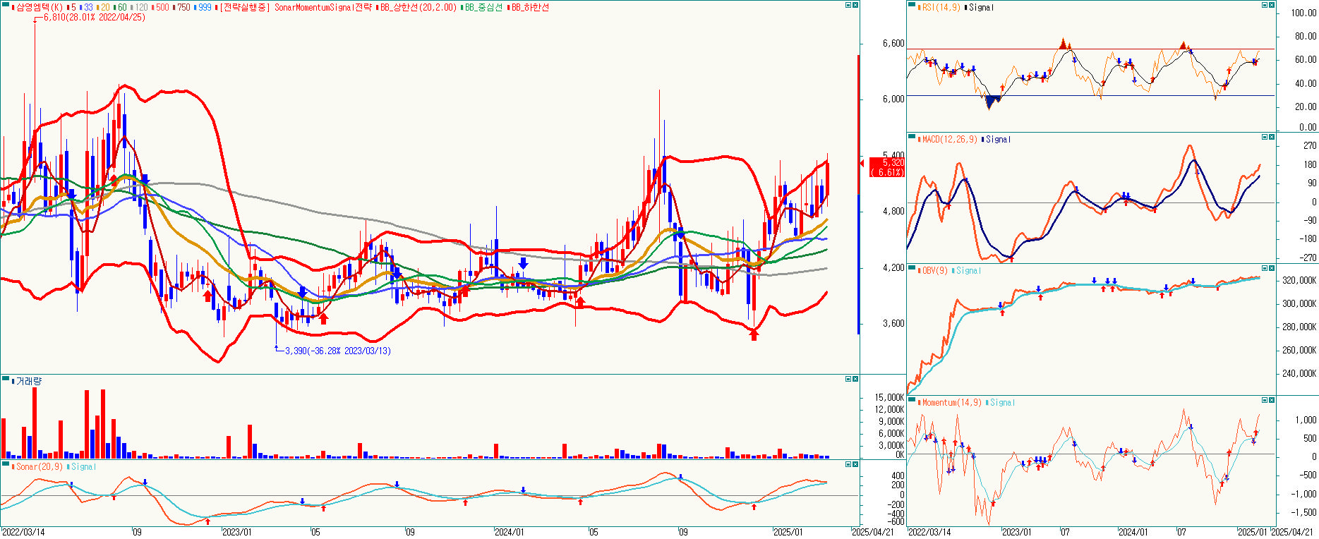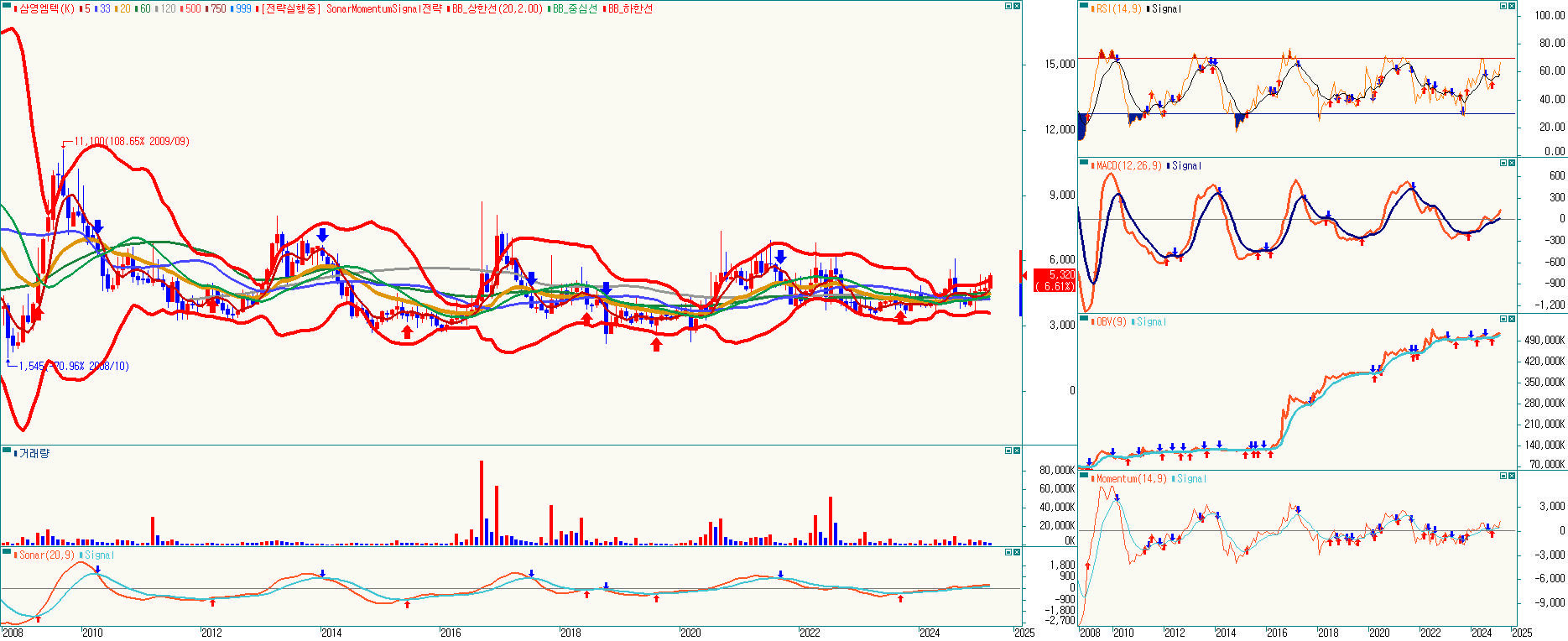 삼영엠텍은 장기적, 중기적 관점에서 강한 상승 추세를 유지하고 있으며, 거래량과 기술적 지표 모두 긍정적인 신호를 보내고 있습니다.