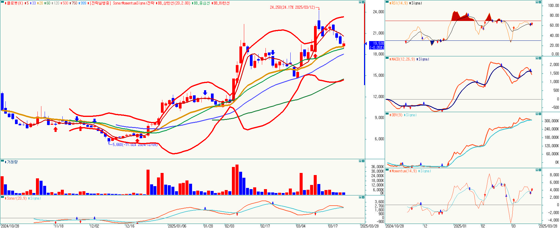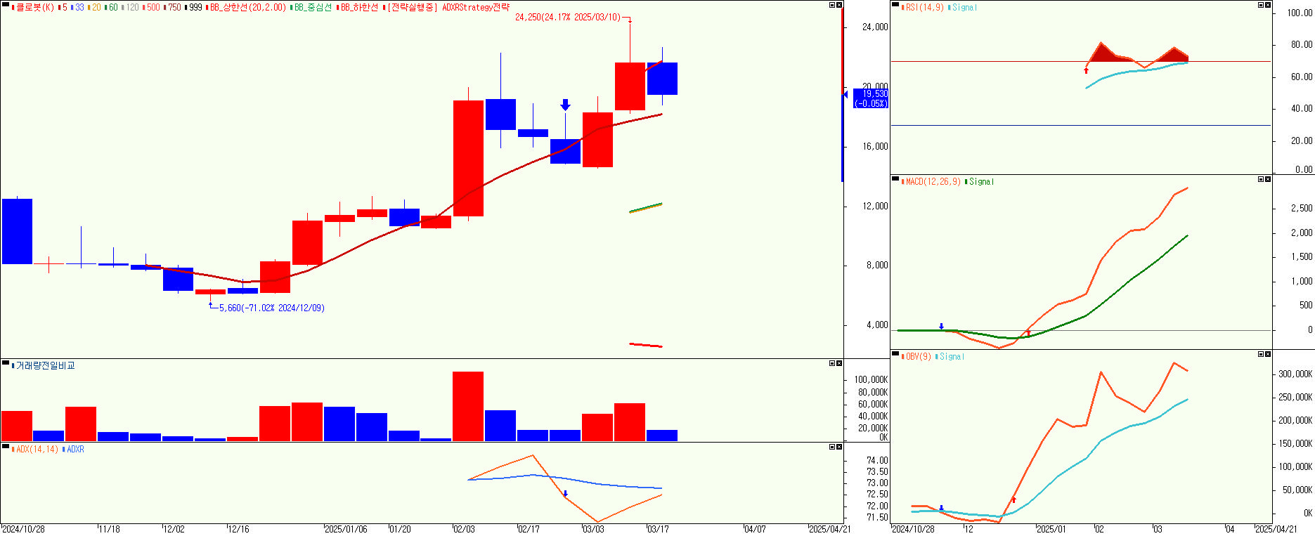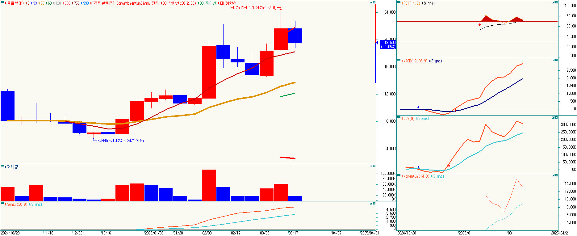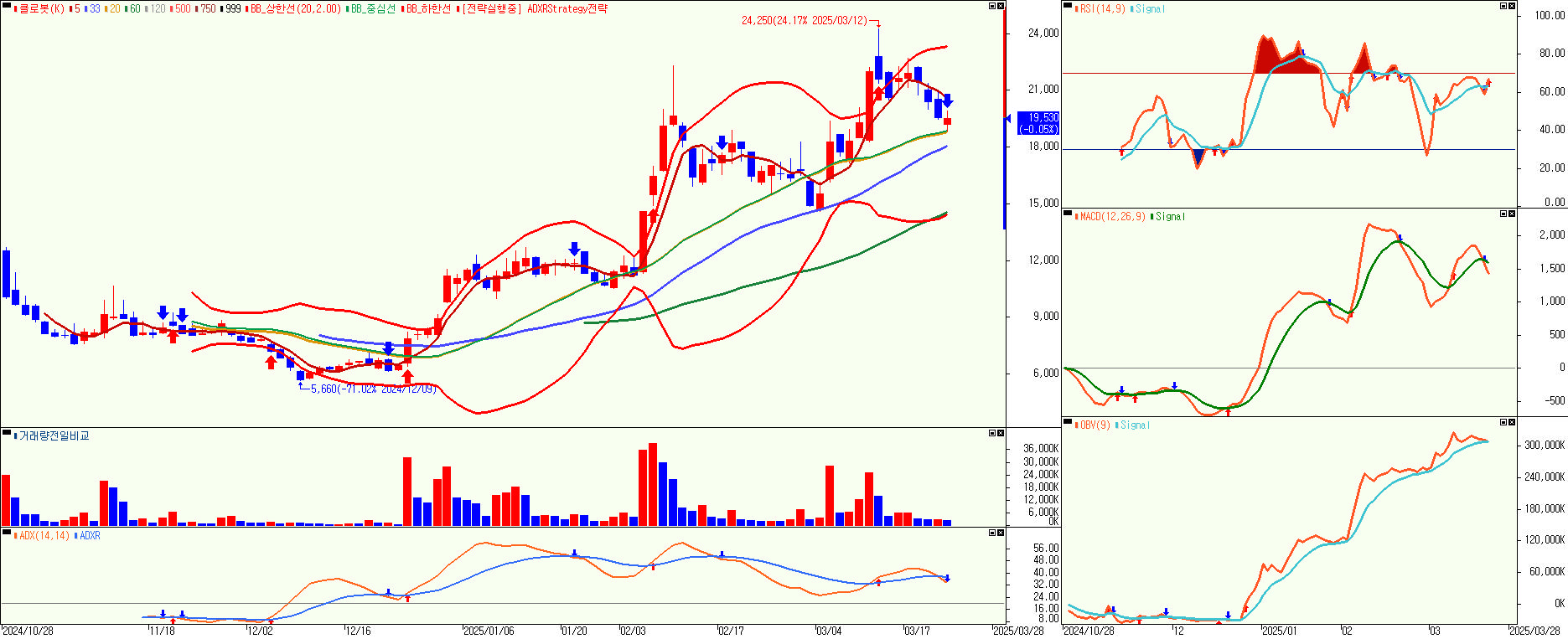 - 장기 상승 추세 유지: 2024년 12월 9일 최저점(5,660원) 이후 강한 상승세를 보이며, 2025년 3월 초 최고점(24,250원)을 기록했습니다.