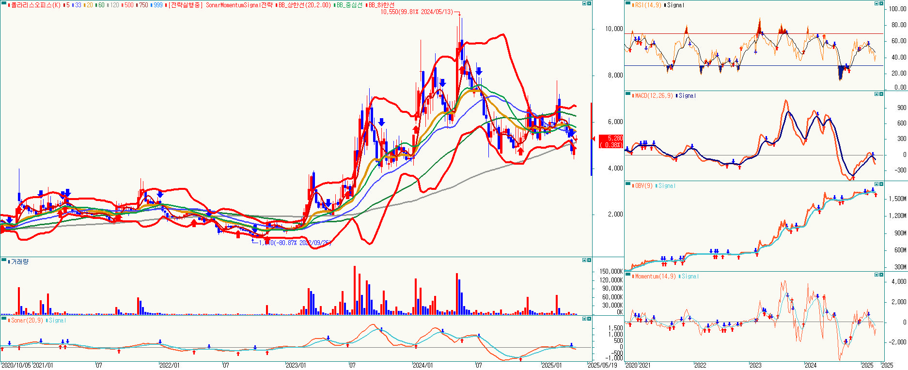 - 주봉 볼링저밴드: 2023~2024년 상승 시 밴드 폭이 크게 확대된 후 현재는 축소 국면. 주가가 밴드 하단에 가깝게 움직이나 아직 완전한 바닥 신호는 아님.