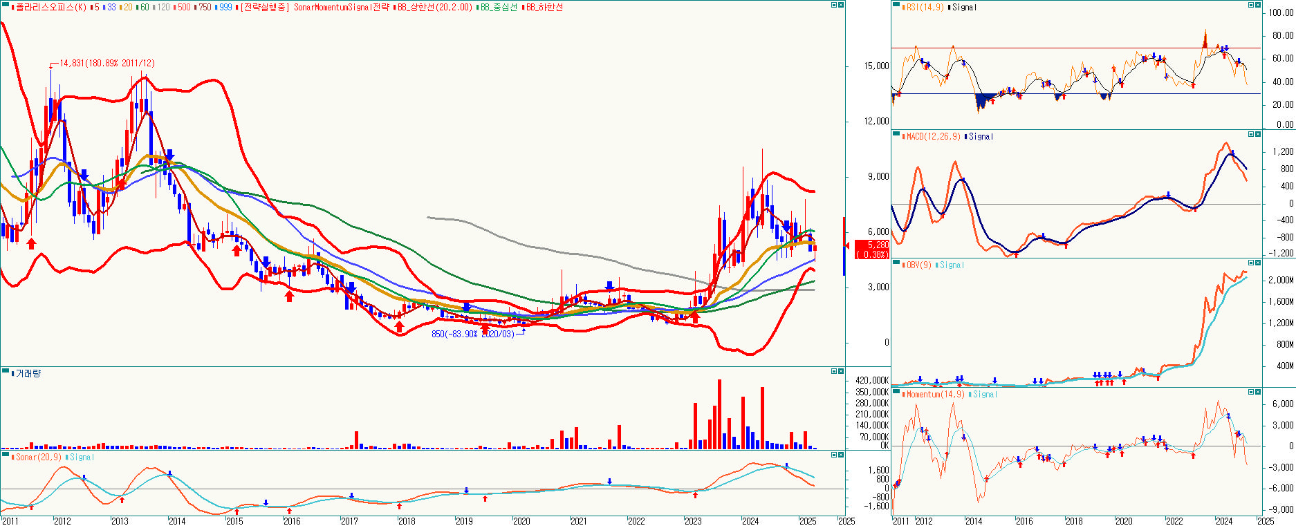- OBV와 장기 이동평균선이 견조하게 유지되는 점, 2011년 고점(14,830원) 대비 현저히 낮은 주가, P/S 0.87 수준의 저평가 상태 등은 장기 투자 관점에서 긍정적 요소