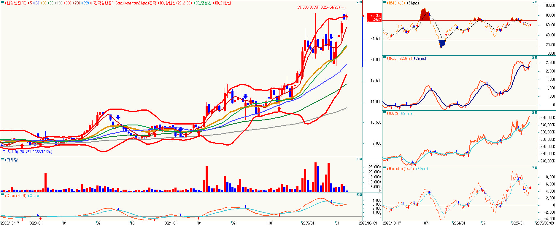 - 일봉: 29,300원까지 단기 급등, 이동평균선 상단, 볼린저밴드 상단 돌파로 단기 과열 신호. 거래량 증가와 함께 단기 조정 가능성.