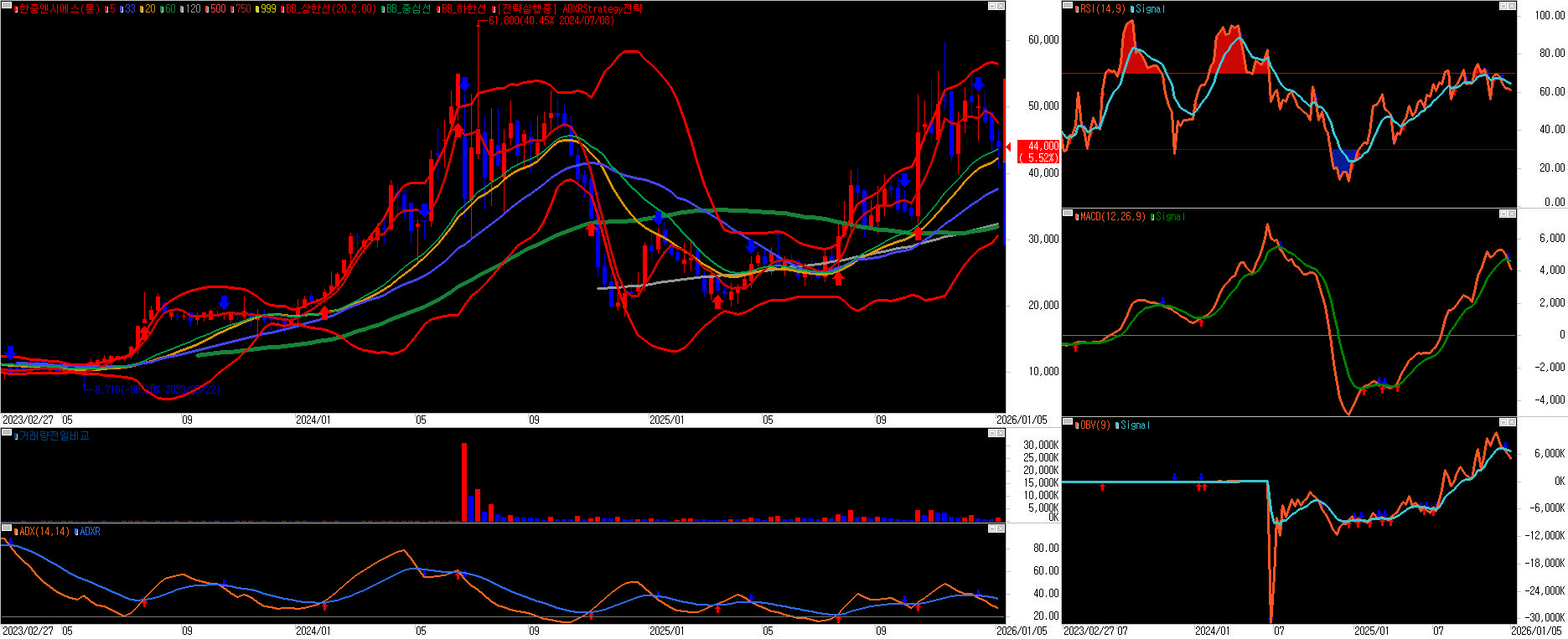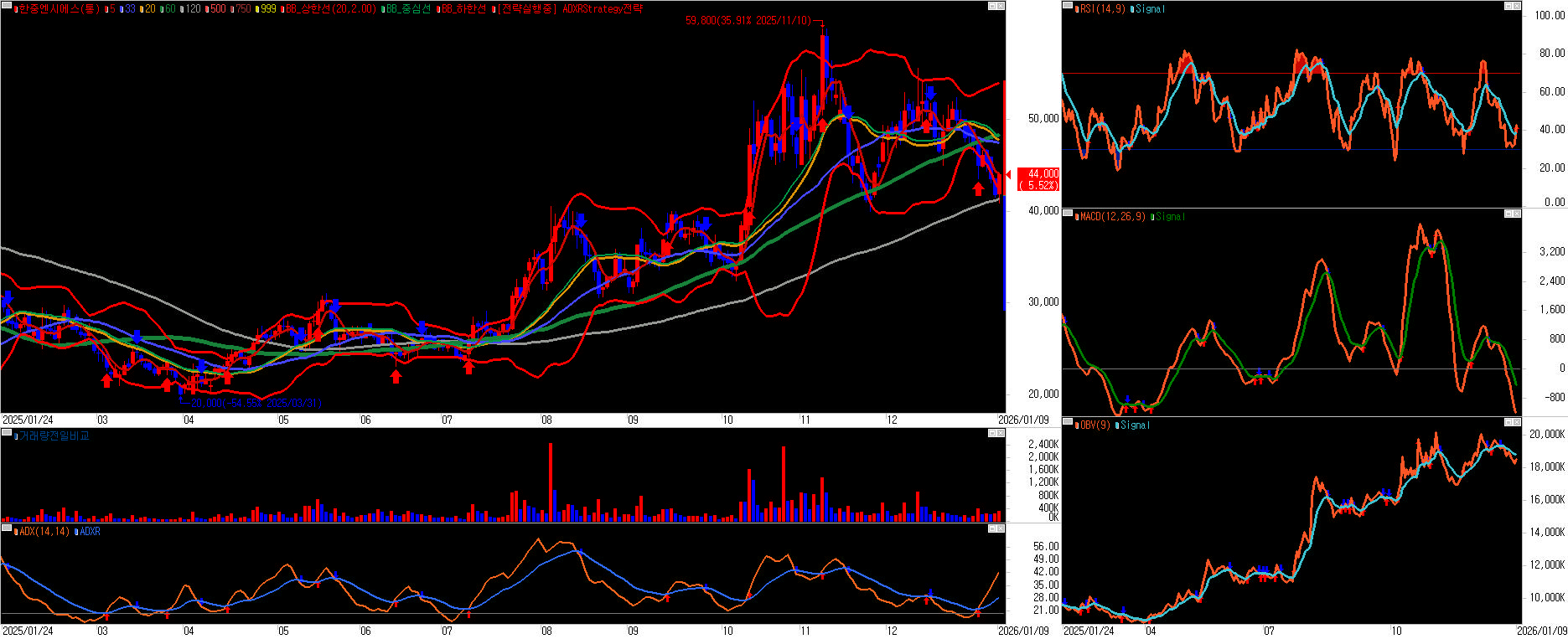한중엔시에스는 1월 초까지 큰 호재(내연기관 정리·ESS/EV 재편, 리포트 유지 등)가 반영된 뒤, 1월 9일 기준 최근 10거래일 구간에서는 차익실현·수급 악화·업종 및 지수 변동성이 겹치며 눌림 조정을 받은 것으로 볼 수 있다. 구조적 펀더멘털은 양호한데, 단기 가격과 수급이 과열 → 조정 국면으로 전환된 전형적인 패턴에 가깝다