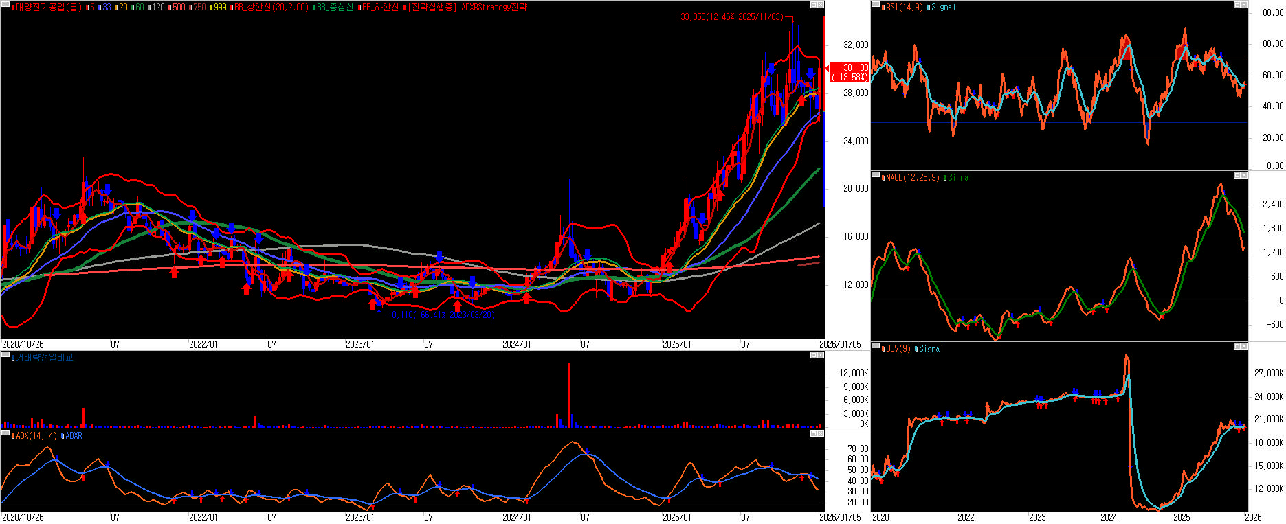 대양전기공업은 2026년 1월 9일 기준으로, 2025년 말 이후 센서·방산 성장 기대에 따른 급등 구간을 지난 뒤 단기 과열 해소, 수급 조정, 테마 피로 등이 겹치며 조정/변동성 구간에 진입한 것으로 보는 편이 합리적이다