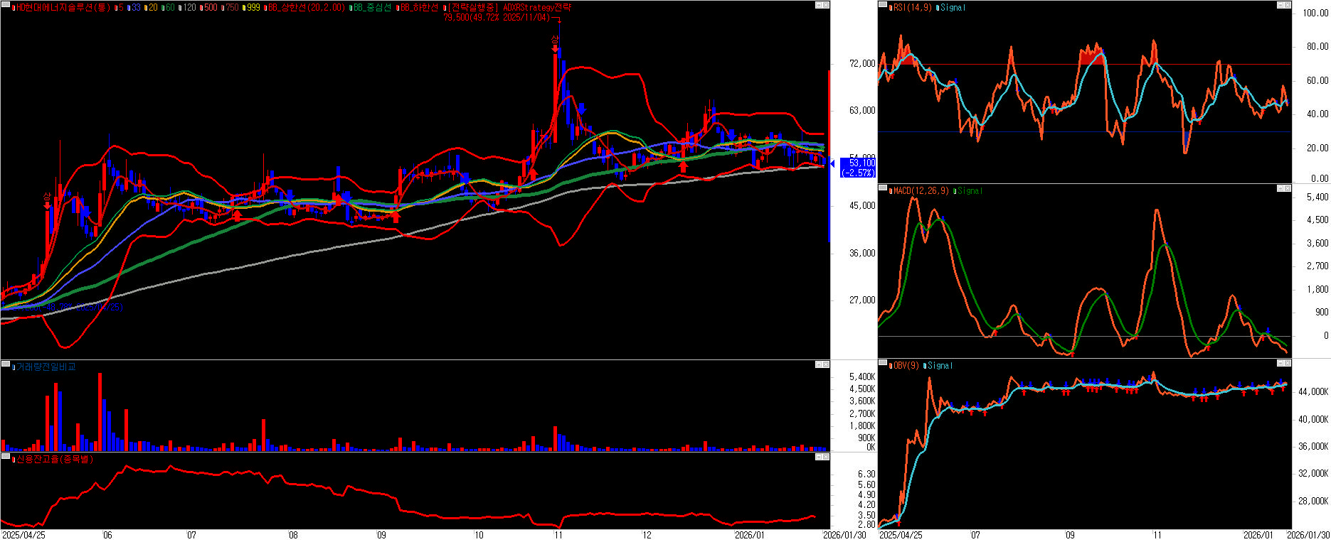 - 동종 에너지·태양광·전력기기 그룹주(HD현대일렉트릭 등) 사이에서 상대 수익률 조정, 포트 교체가 진행되며, 일부 자금이 실적이 이미 확인된 종목으로 이동해 HD현대에너지솔루션에는 상대적 매도 압력으로 작용했습니다
