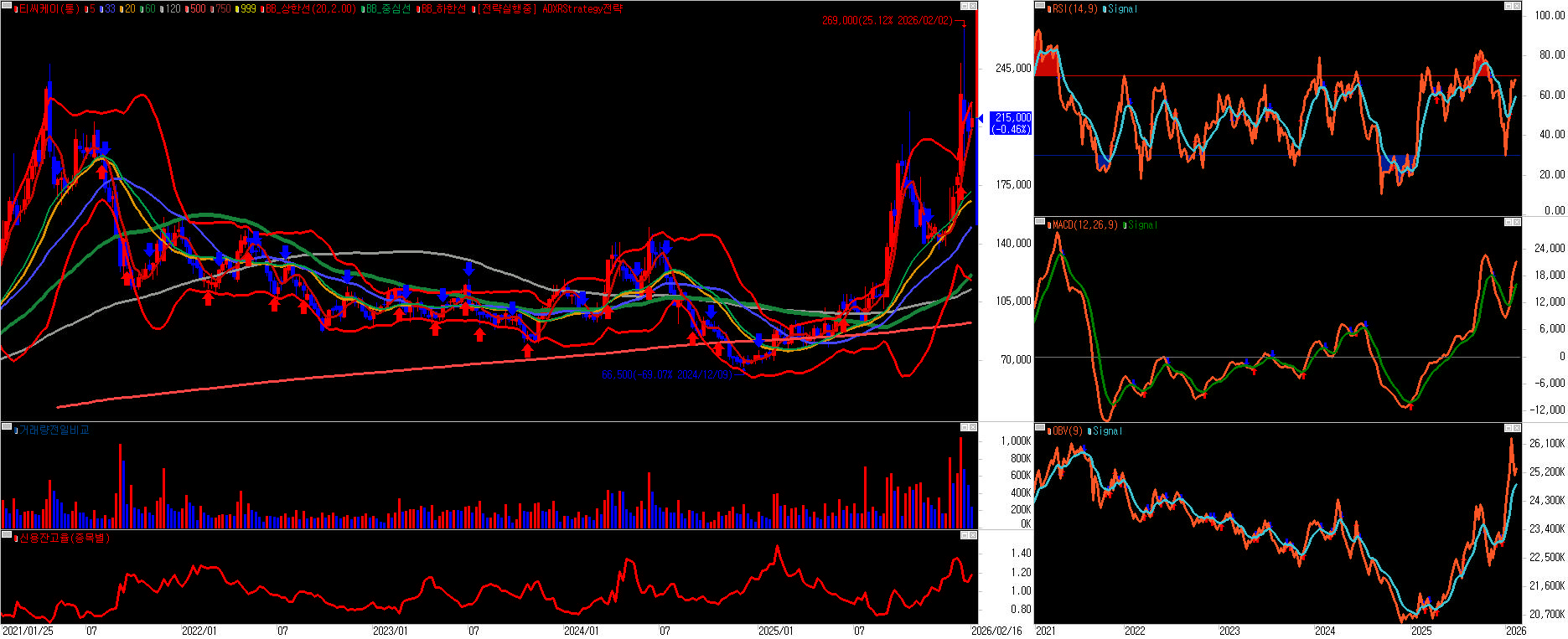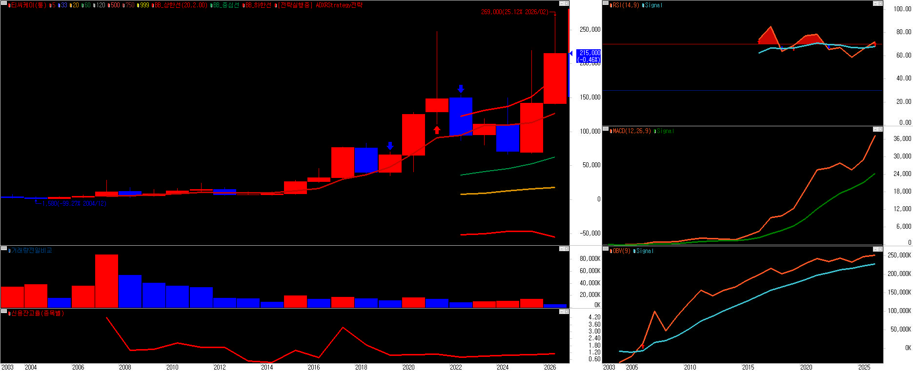 - 2024년 말~2026년 1월까지 6만 원대에서 20만 원대 이상까지 상승하는 과정에서, 일반적으로는 단기 개인 신용 물량이 급격히 늘기 쉬우나, 티씨케이는 기관·외국인 수급 주도 영향으로 신용 잔고가 폭발적으로 늘었다기보다는 ‘완만한 증가 → 유지’ 수준에 가까운 흐름을 보여온 것으로 판단됩니다