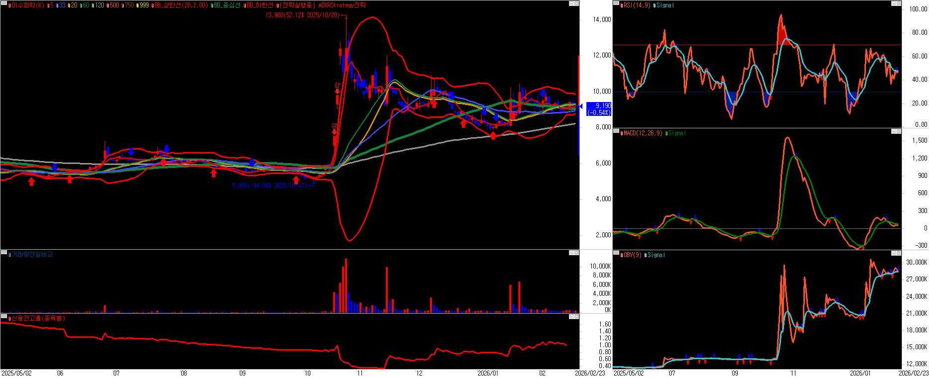최근 12거래일(2026-02-23 기준) 이수화학 주가 하락은 “실적 공시의 해석(매출 감소·순손실 지속)”, “오버행(자기주식 처분) 이슈”, “석유화학 업황/스프레드 불확실성”, “수급·심리 약화”, “기술적(차트) 요인”이 겹친 성격으로 정리하는 게 가장 깔끔합니다
