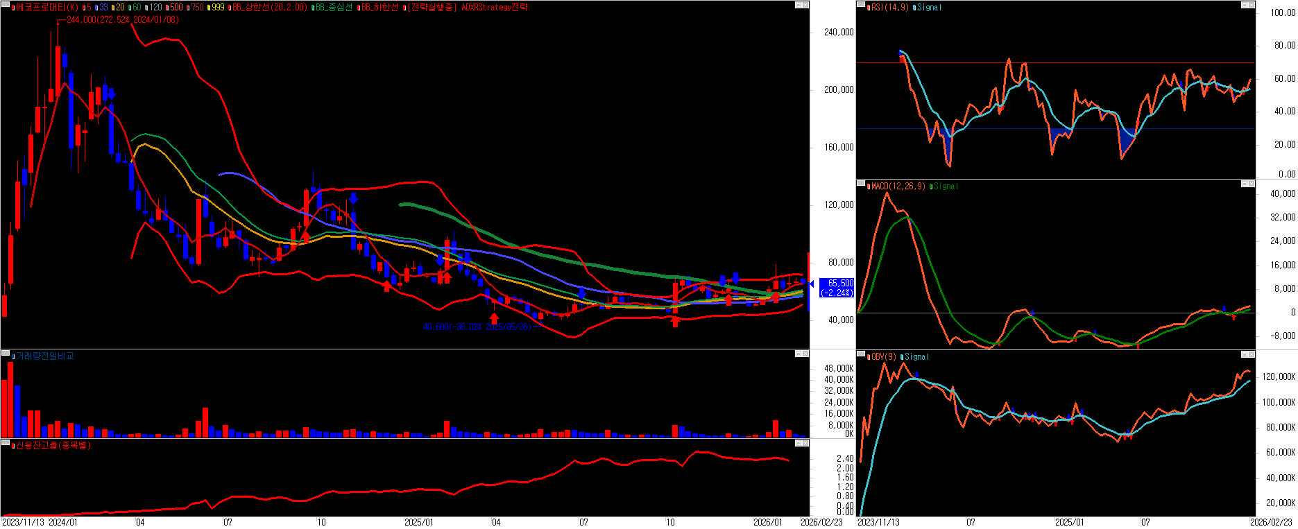 - 2월 초 컨콜·뉴스 이후 단기 급등 → 조정 구간을 거친 뒤, 재차 거래대금이 붙으면서 9거래일 연속 강한 캔들이 이어지는 흐름이 나타나며 기술적 추세 추종 매수 유입.