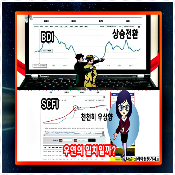 2020년 급락장 이후 천천히 상승했던 해운주 대장주인 HMM의 주가, 10월에 접어들며 한바탕 급등세를 보이며 휴식에 들어갔죠. 해운주, 너무 오래 쉬었고 투자자들을 너무 힘들게 했던 주식이죠. 하락 구간 중간 중간에 급등을 했던 적도 있었지만, 구조조정, 유상증자등등 아픔을 많이 겪었던 업종이네요. 해운주 대장주인 HMM의 주가 흐름을 잘 보시면, 해운주의 주가와 관련해서 나침판 역할을 해주는 INDEX가 있었죠. 기존에 소개했던 "BDI지수" 오늘 추가로 소개할 "SCFI"지수와 비교를 해볼께요. HMM주가와 BDI지수를 비교해보면 BDI지수가 먼저 상승한뒤 HMM주가가 움직인것을 확인할수 있구요.